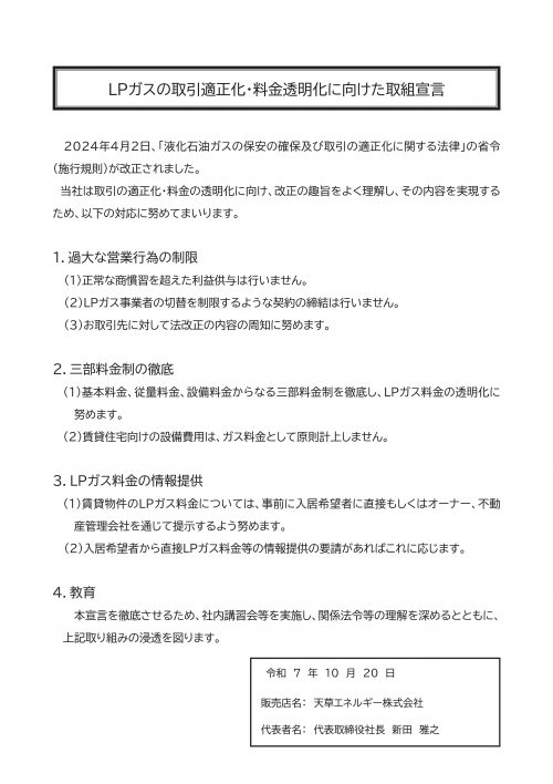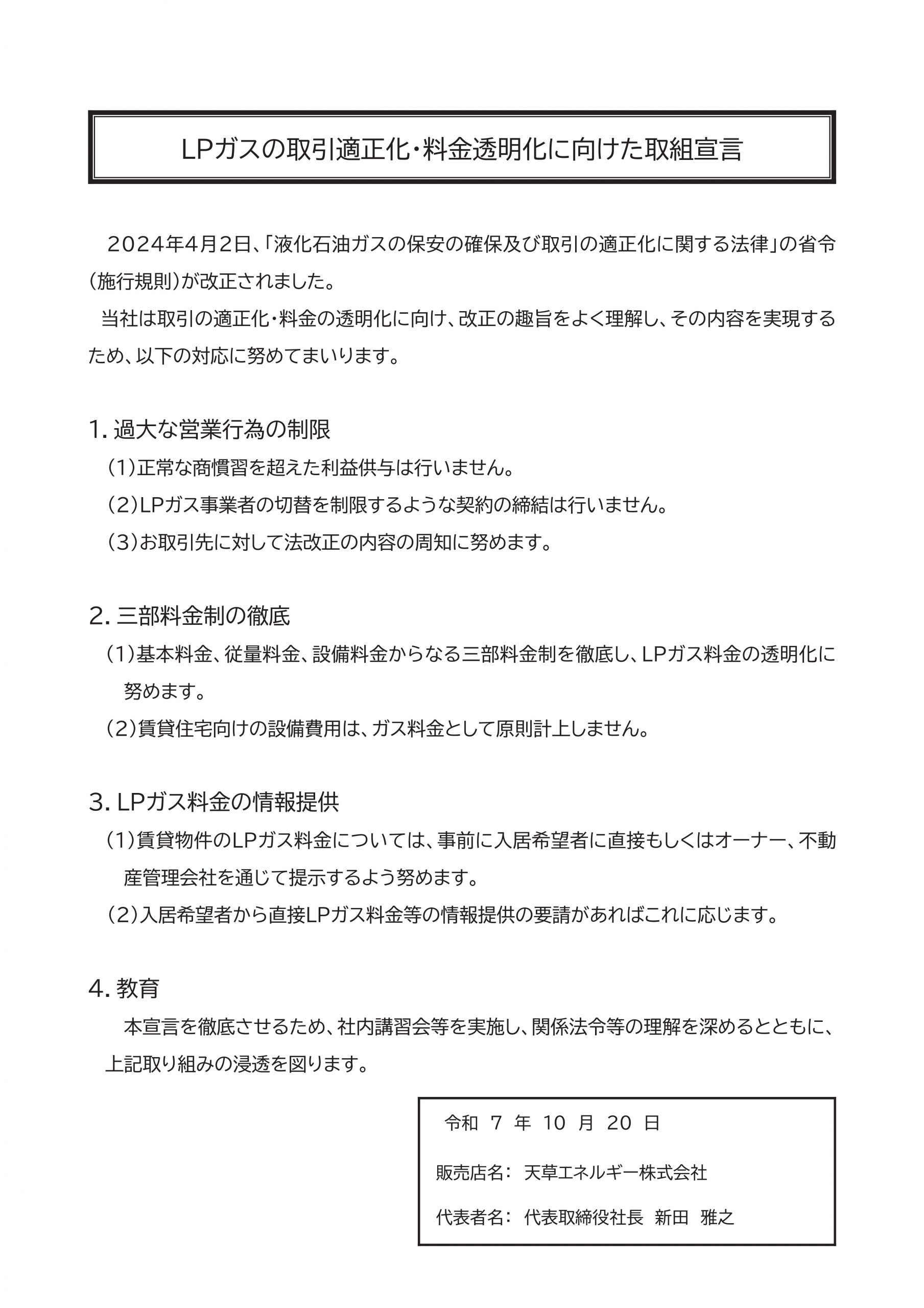天草エネルギー株式会社並びに天草エネルギーグループは、LPガスの取引における適正化と料金の透明化を積極的に推進し、安全・安心なエネルギー供給体制の構築に努めます。また、地域に根差した事業活動を通じて、持続可能な社会の実現と地域経済の活性化に寄与すべく、今後も誠実に取り組んで参ります。