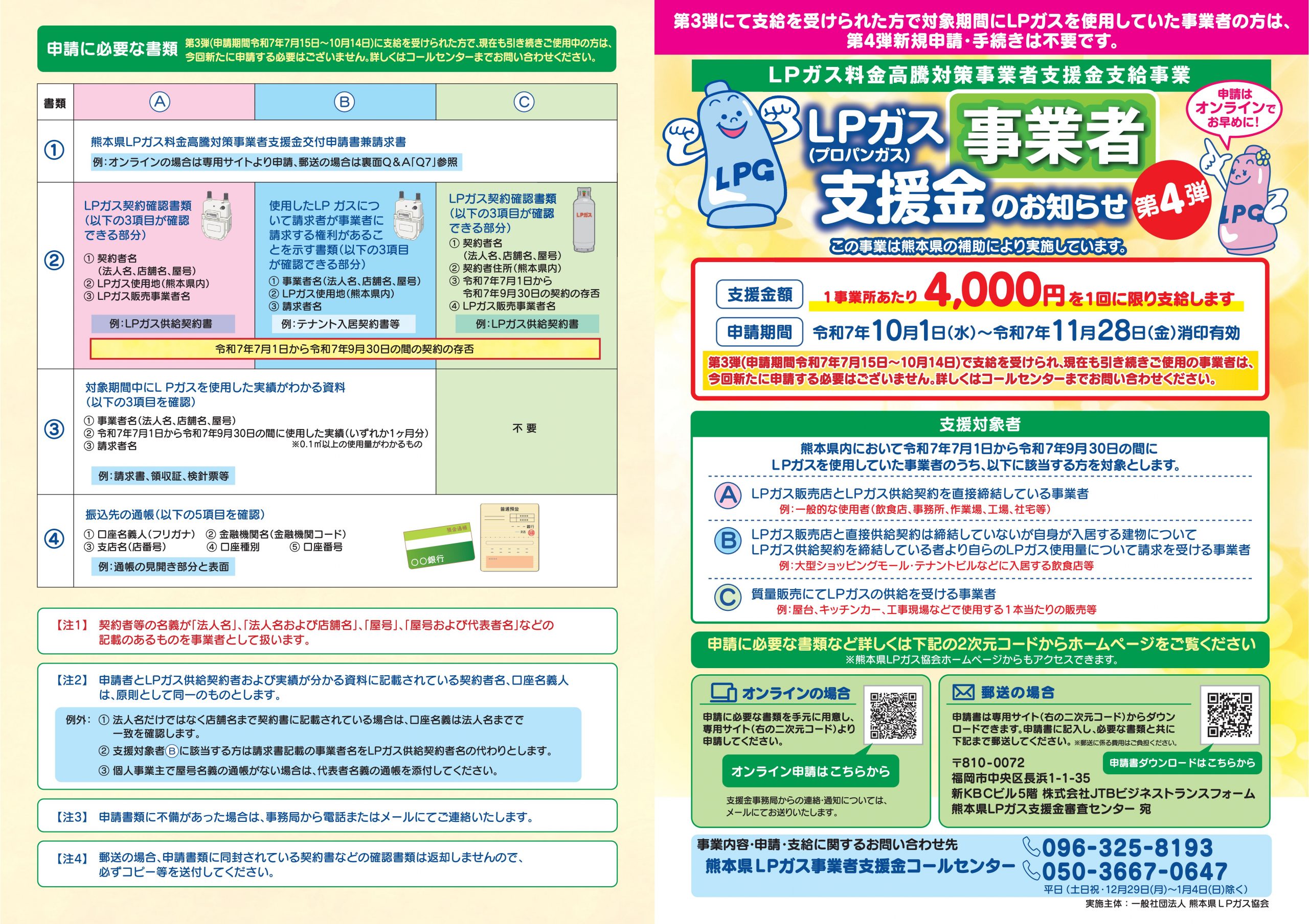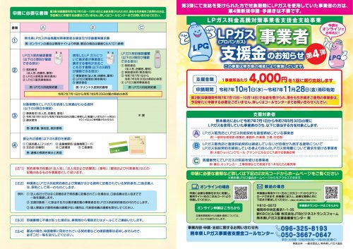 令和7年10月1日より熊本県内においてLPガス事業者支援金第4弾(1事業所あたり4,000円)の申請が開始されました。
