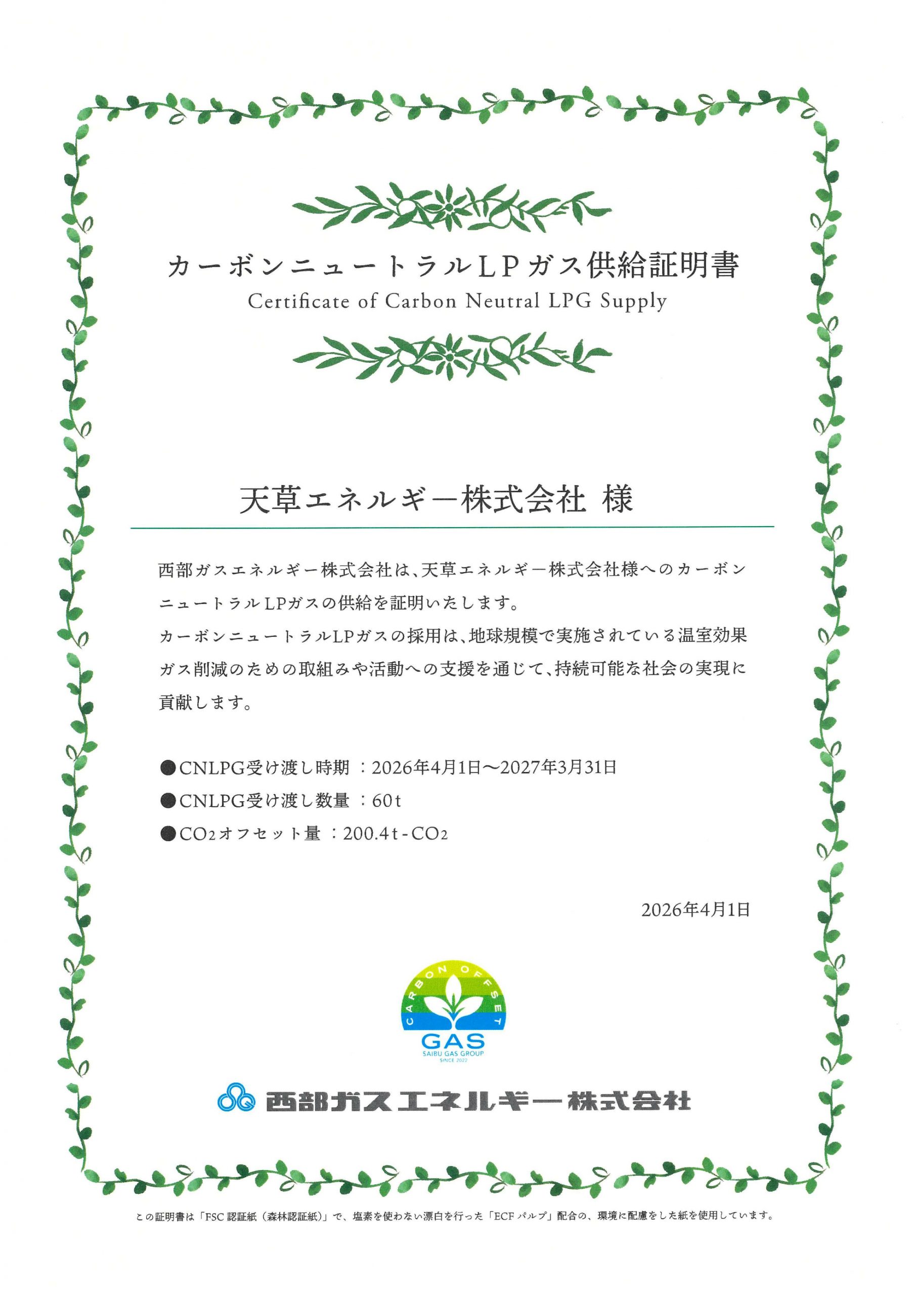 当社は2022年12月23日より西部ガスエネルギー株式会社様とカーボンニュートラルLPガス(CN-LPG)の売買に関する契約を締結し、毎年受け渡しを行っております。